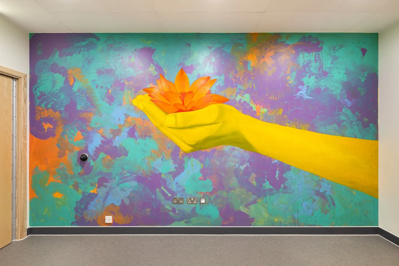 The mural features a radiant yellow hand offering an orange lotus flower. The gesture is both simple and profound: a symbol of care extended, of new beginnings unfolding. Rendered in acrylic, the hand glows against the room’s walls, offering a moment of brightness to patients, visitors, and families navigating complex emotional journeys.