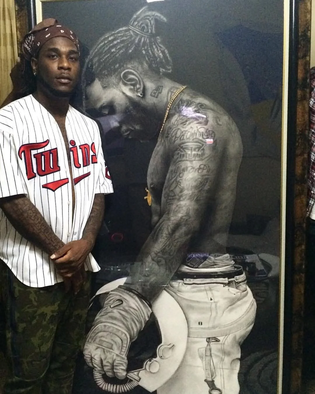 Commanding the cover of Burna Boy’s seminal album On A Spaceship, Ken Nwadiogbu’s hyperrealist portrait transforms the musician into a modern icon of strength, introspection, and ascension. Rendered in charcoal at an extraordinary scale of 42 x 74 inches, the drawing depicts the Grammy Award winner, Burna Boy, cradling an astronaut’s helmet. His head bowed, his torso marked with tattoos, his posture quiet yet unyielding. The background, a cinematic grayscale with the faint silhouette of a rising spacecraft, situates the figure at the edge of earthly reality and otherworldly ambition.