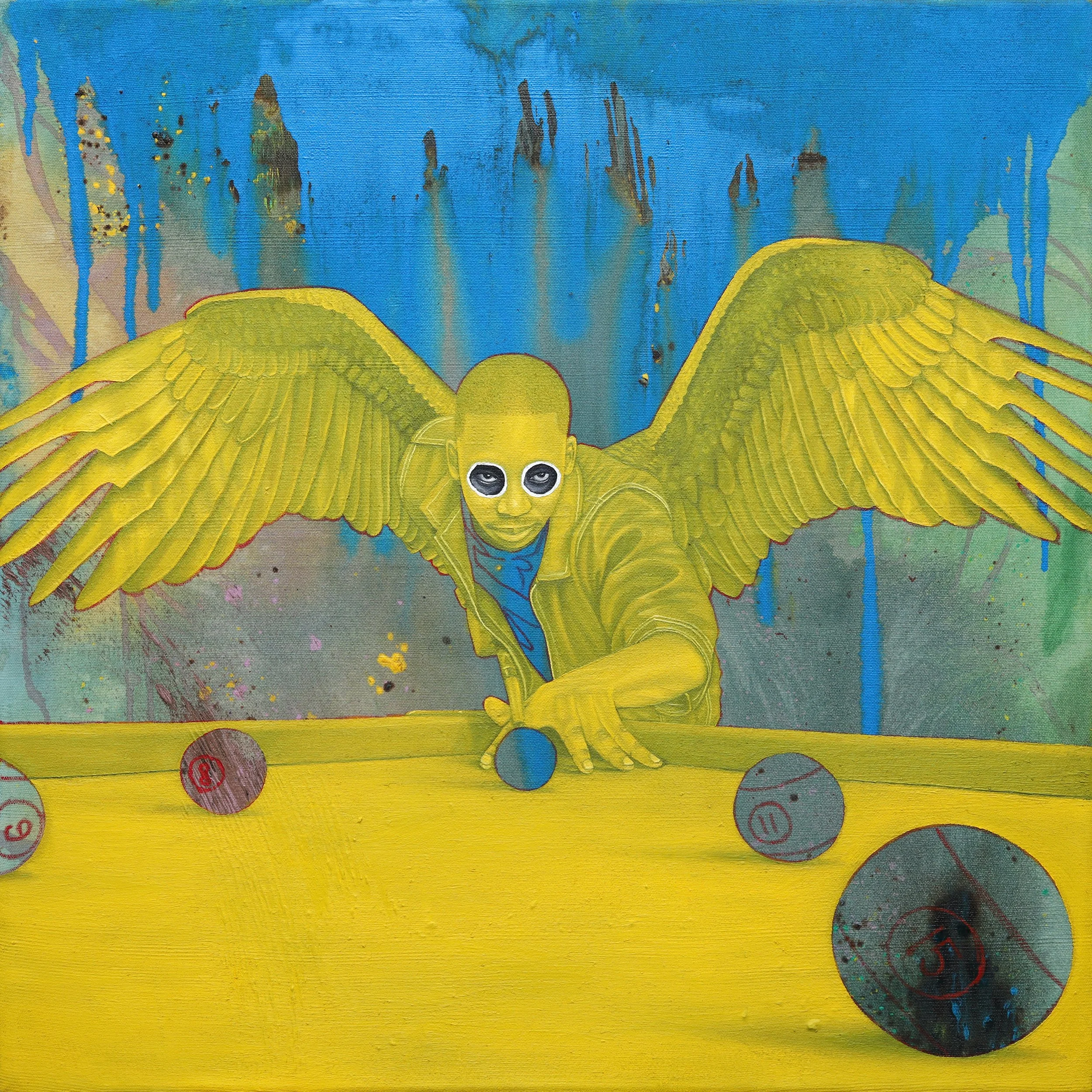 Nwadiogbu works from photographs that he has taken of his friends, family and other members of the Black immigrant community. Rather than simply recreating the photographic image, however, Nwadiogbu zooms in on specific details or moments that are emotionally charged. He begins by pouring paint onto the canvas, responding to the movement and emotion of colour, his psychological state and the rhythm of the music that he plays in the studio, before painting the figure and fragments of contextual information on top of this textured surface in heightened detail. The result is a series of haunting scenes that sit somewhere between stillness and movement, reality and dream.